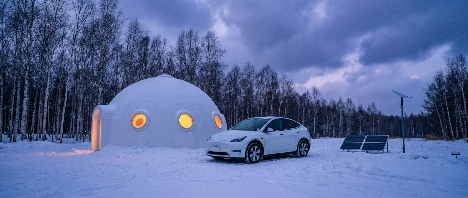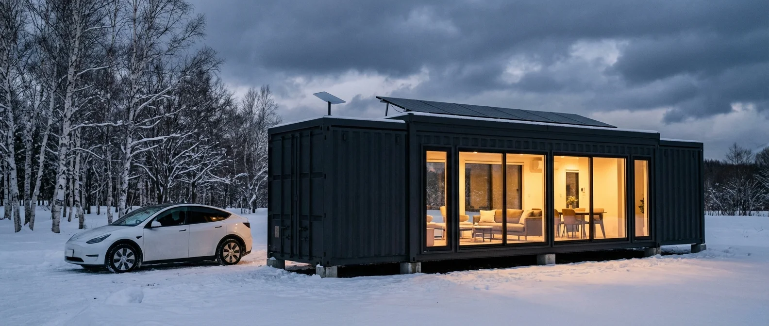 高台から360度の原野を一望する熊牛の秘境。中国・山東省の工場でスチールフレームと内装の9割を仕上げた40ft拡張モジュールを、コンテナ船で札幌港へ輸送。現地でラフタークレーンが30分で展開し、折り畳まれた12m×3mが12m×6.4m(約37㎡)の空間へ開く。天井高2.8m、カラマツ床板、薪ストーブ、床まで届く大窓から原野が続く——その日から住める状態で完成する。その後、国内施工業者が北海道基準(HEAT20 G2)の断熱・井戸・太陽光・薪ストーブを追設して仕上げ。在来工法の1/3のコストで同等以上の居住性を実現する。